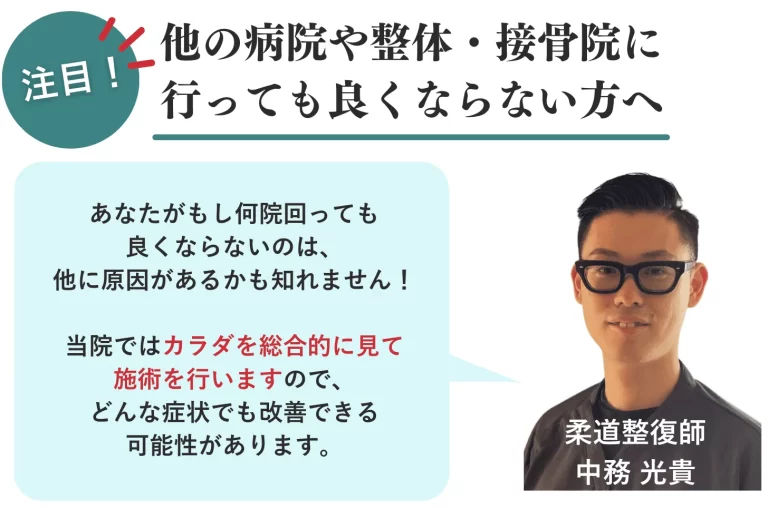 病院やマッサージ、整骨院に行っても同じしびれを繰り返してしまう。肩こり・腰痛が当たり前になっている、薬を飲んで症状を抑えている方。一度来院しませんか?身体のしびれ・肩こり・腰痛を改善させます。
